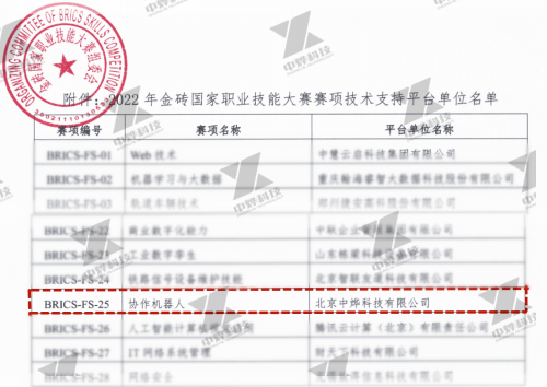 7月29日,金磚國(guó)家職業(yè)技能大賽組委會(huì)發(fā)布文件《關(guān)于公布2022年金磚國(guó)家職業(yè)技能大賽賽項(xiàng)技術(shù)支持平臺(tái)單位的通知》,中燁科技將為2022年金磚國(guó)家職業(yè)技能大賽“協(xié)作機(jī)器人”賽項(xiàng)提供全流程技術(shù)支持!